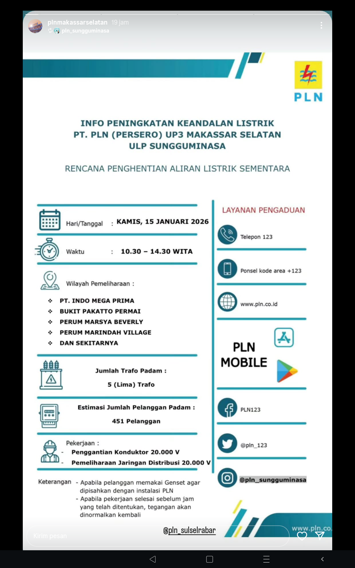 MAKASSAR,REWA — PT PLN (Persero) Unit Pelaksana Pelayanan (UP3) Makassar Selatan melalui ULP Sungguminasa akan melakukan penghentian aliran listrik sementara pada Kamis, 15 Januari 2026.Pemadaman